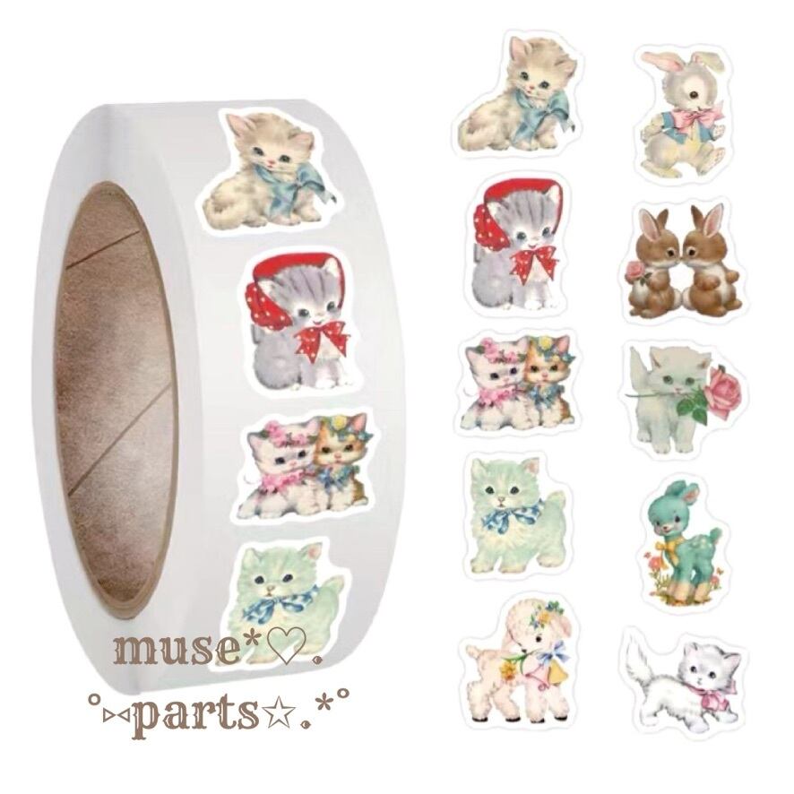 50枚 シール レトロアニマル ねこ ネコ 猫 キャット うさぎ ウサギ 犬 トイプードル ひつじ 羊 子猫 動物 サンキューシール ステッカー リボン お花 フラワー 薔薇 ゆめかわいい バレエコア ヴィンテージ ハンドメイド 結婚式 ハロウィン クリスマス イベント プチギフト プレゼント お裾分け ラッピング ショップ フリマアプリ 梱包 手紙 メッセージ クラフト ありがとうシール コラージュ 文具 文房具 手帳 スタンプ ゆめかわいい ユニコーン ケアシール Thankyouシール ロール完売品