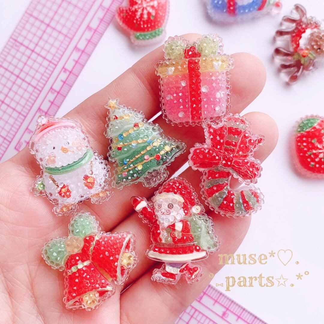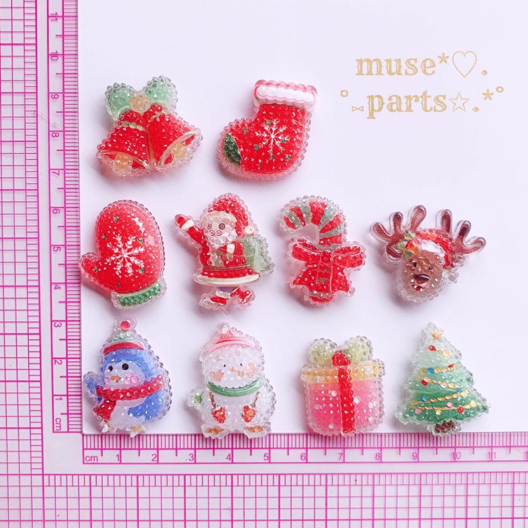 4個ペンギン/ステッキ/クリスマスツリー/ベル/手袋/サンタクロース/ブーツ/雪だるま/プレゼント/トナカイ★クリスマスデコパーツ★カボション 雪の結晶 貼り付けパーツ ハンドメイドパーツ 手芸材料 キッズ 大人